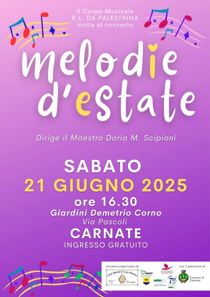 Il corpo musicale P. L. da Palestrina invita ad un piacevole pomeriggio di melodie d’estate, per un rinfrescante e divertente concerto! Vi aspettiamo numerosi sabato 21 giugno alle 16:30 presso i Giardini Demetrio Corno, in via Pascoli a Carnate (MB).